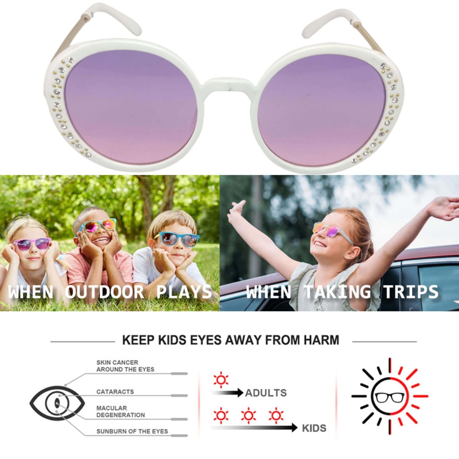 • Stylish Design: Round frames with decorative rhinestones, making them fashionable and fun to wear.